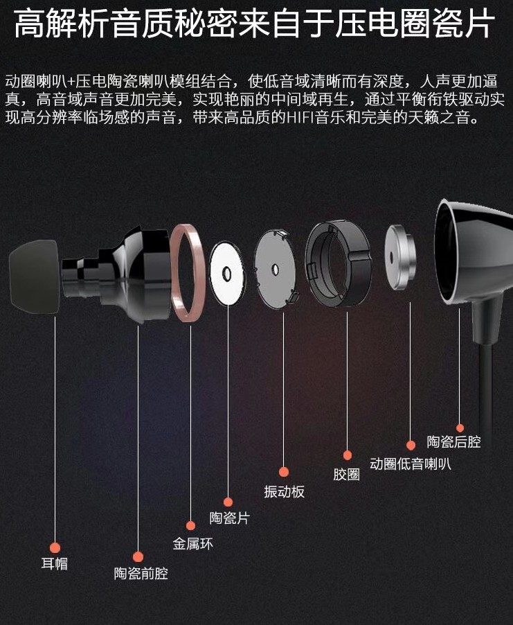 使得声音更加自然动听。圈瓷单元可以在高解析度的情况下又不失声音的圆润度,这也避免了动铁单元为了追求高解析,而使得声音听着有些发冷僵硬。